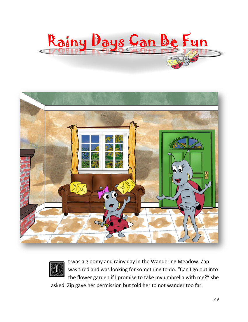 The rain is light and Zap wants to go explore outside. Zip says it's okay as long as she stays near the house. Zap hears, smells, and sees many amazing things, Just when she thinks she's seen it all, she sees the very thing that she was looking for the whole time, and it is truly amazing.